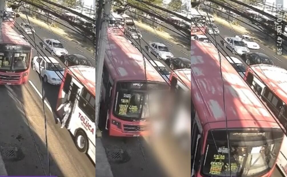 Edomex fue el escenario de un siniestro vial que casi le cuesta la vida a una mujer. Ocurrió sobre la avenida Adolfo López Mateos, en Toluca, y tal como se ve en el video captado por cámaras de seguridad la situación no pasó a mayores de milagro y gracias al rápido accionar de un chofer de un camión del transporte público de pasajeros.