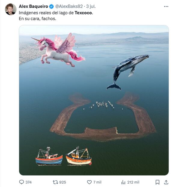 La imagen muestra la zona completamente inundada, con algunas áreas de tierra sobre la superficie y en el centro lo que parecieran ser aves o gaviotas. La foto generó polémica rápidamente, pues mientras los simpatizantes y militantes del partido de Morena compartían la imagen, los usuarios se cuestionaban acerca de su autenticidad.