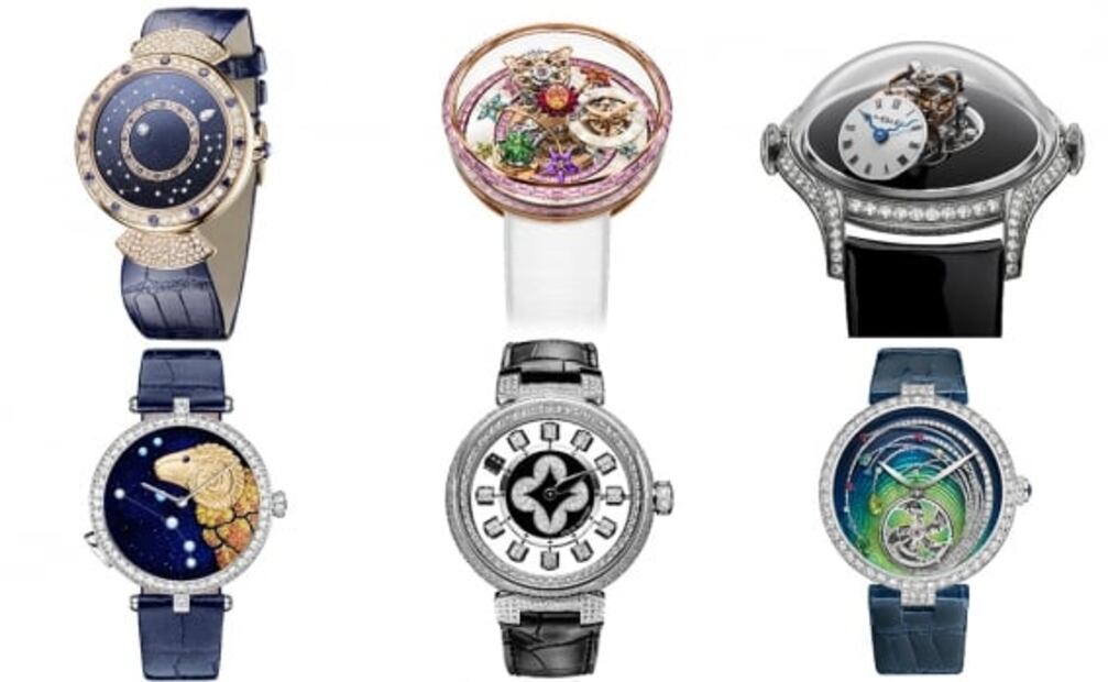 Bvlgari Divas' Dream The Roman Night; Jacob&Co Fleurs de Jardin, MB&F Legacy Machine FlyingT; Van Cleef & Arpels Lady Arpels Zodiac Lumineux Aries watch; Louis Vuitton Tambour Spin Time Air Paved; Van Cleef & Arpels Lady Arpels Zodiac Lumineux Aries watch.