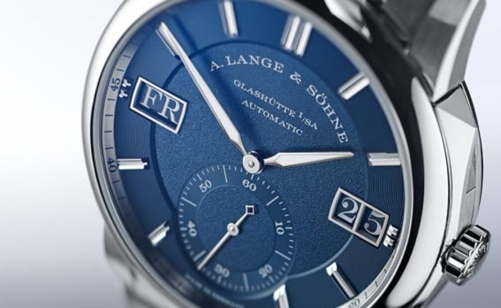 Los detalles añaden valor y marcan siempre la diferencia. Su esfera tridimensional azul oscuro juega con el acabado irregular de la superficie principal en mate, al igual que el pequeño segundero, y líneas concéntricas bajo la técnica llamada “azurage”. Presenta un bello anillo biselado en color plata con la minutería que rodea la esfera. Las agujas típicas de Lange para esta pieza son de oro blanco.