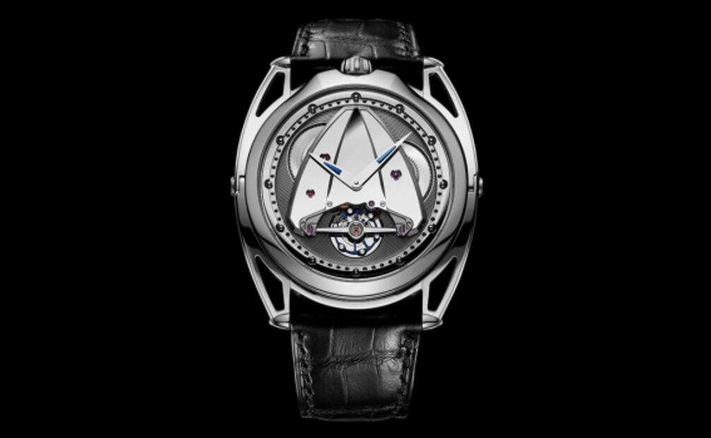 En su carátula hay una multitud de formas diferentes: hemisféricas, cóncavas, esféricas, distintos acabados... El dial está hecho completamente de Microlight. Al jugar con luces y sombras, agrega profundidad y ofrece un resultado más arquitectónico y dinámico. La platina principal en forma de delta, un sello de De Bethune, está terminada para reflejar perfectamente la luz ambiental. La superficie de metal se pule pacientemente hasta que se convierte en un verdadero espejo, un proceso que puede tardar hasta tres horas. Para decir la hora, pequeñas esferas pulidas como diminutos satélites. Un patrón tono sobre tono rodea la parte central de la esfera elíptica, revelando sutilmente las ruedas del movimiento.