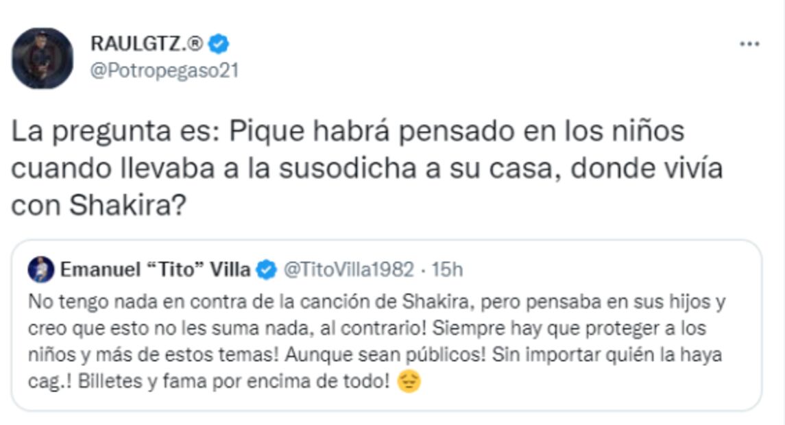 Todo comenzó con una publicación de Emanuel Villa , exgoleador de Cruz Azul y quien en su cuenta de Twitter aseguró que Shakira no pensó en sus hijos, al sacar la canción y únicamente lo hizo por la fama y el dinero.